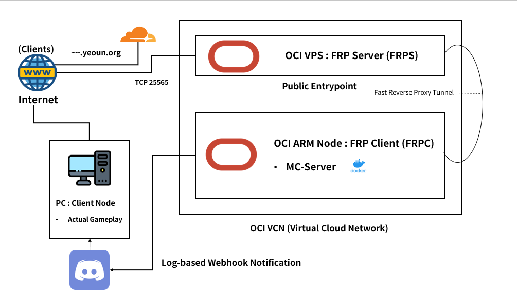 OCI 내부 인스턴스 간(AMD ↔ ARM) 통신은 일반적인 VCN(Virtual Cloud Network) 설정만으로도 가능합니다. 하지만 저는 모든 구간에 **FRP(Fast Reverse Proxy)**를 적용했습니다.