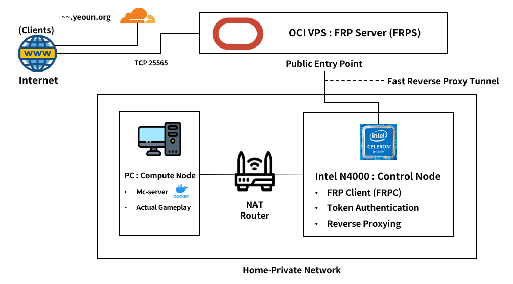 - Public Entry: 패킷은 먼저 **OCI VPS(FRPS)**에 도착합니다. 이때 집의 실제 공인 IP는 철저히 은닉됩니다.